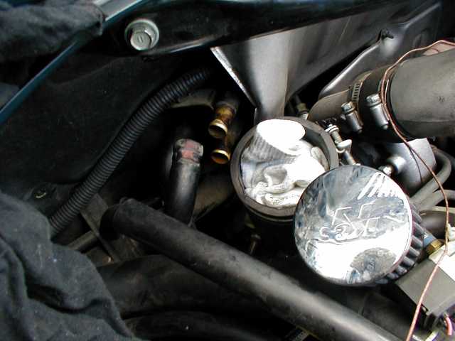 Remove the pressure cap, and begin filling. Watch the top of the system for overflow. It will happen, as the system fills very slowly, and backs up from time to time. Once the hoses up front are to the level of the rear pressure cap you can put the cap back on, and start up the car. Let it run for a few minutes until the temp gauge starts to rise. Turn the car off, check for leaks, and look at the level of the service hoses. If they are low, add more coolant. Repeat this a few times until the system won't take any more. You may now want to take a short drive to verify stability, just keep one eye on the temp gauge. If it goes above half way, their is a problem, since the 3SGTE will never read above half way unless their is something very wrong. "Don't forget to bring a towel", and a your tools and a bottle of coolant.